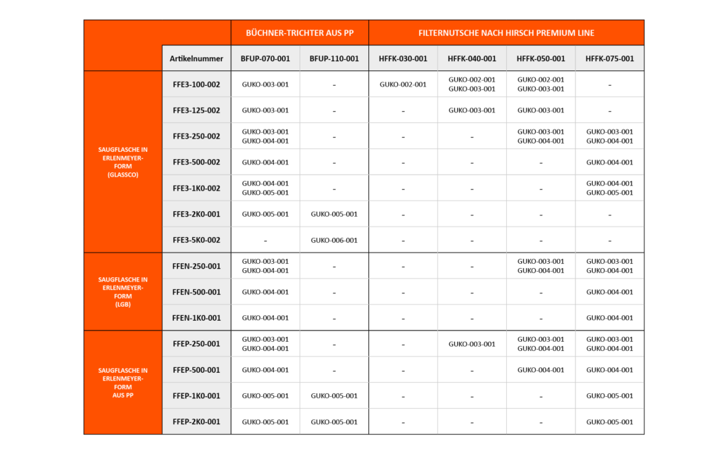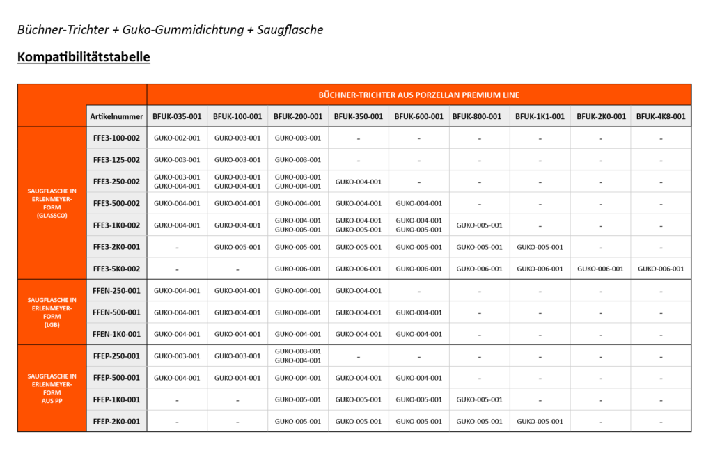 Kompatibilitätstabelle: Büchner-Trichter + Guko-Gummidichtung + Saugflasche