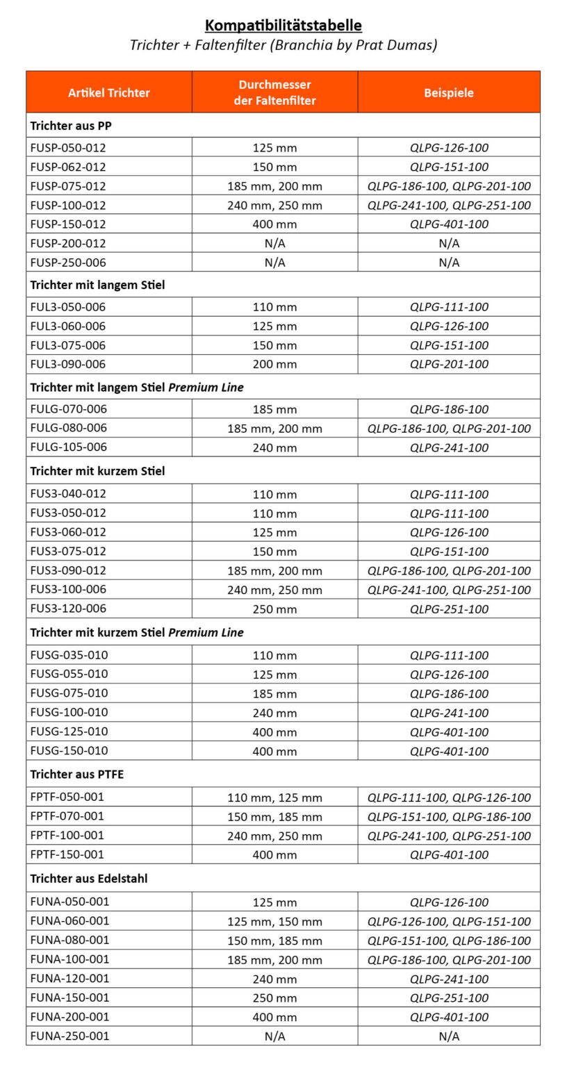 Kompatibilitätstabelle Trichter + Faltenfilter (Branchia by Prat Dumas)