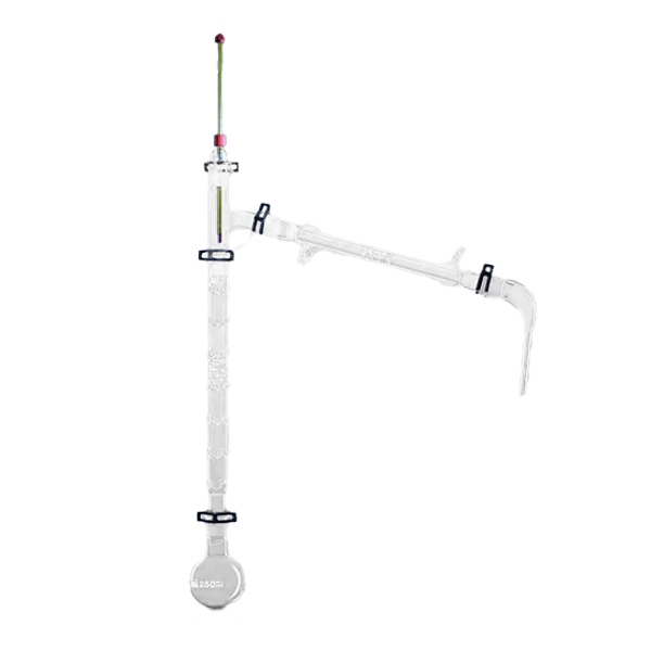 Aus hochwertigem Borosilikatglas LBG 3.3. Das komplette Set beinhaltet eine Vigreux-Säule, einen 250 mm Liebig-Kühler, einen 250 ml Rundkolben, einen Destillieraufsatz, ein Thermometeradapter, einen Destilliervorstoß, ein Thermometer (-10 bis +110 °C) und die für die Schliffbauteile notwendigen Klemmen aus POM. Alle Normschliff-Glasgeräte 29/32. Die Olive eignet sich für Schläuche mit 8 mm Innendurchmesser. Es wird empfohlen, mit 2 Stativen RTMM-300-001, 2 Klemmen RCD3-060-001, 4 Doppelmuffen BOSS-001-004, Heizmantel HEAM-250-001, Laborheber JACA-200-001, Erlenmeyerkolben EFNG-500-010, Silikonschlauch SILT-008-005 und Schliff-Fett SGRE-025-100 zu kombinieren
