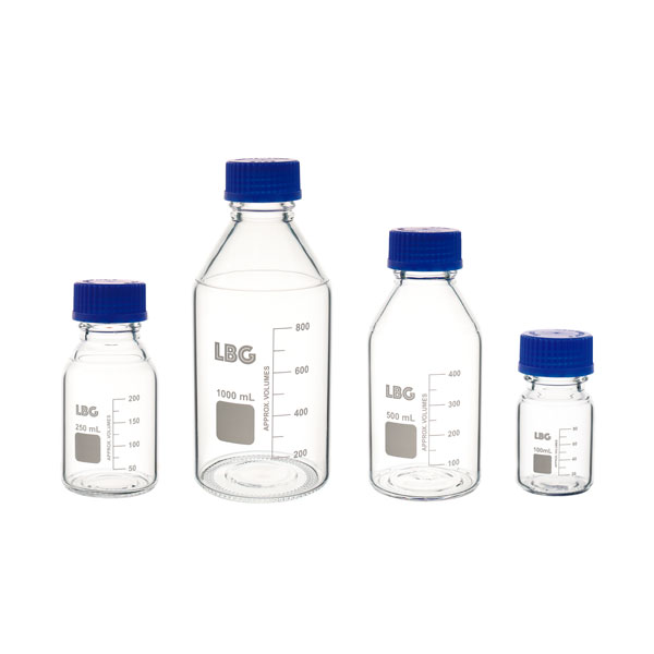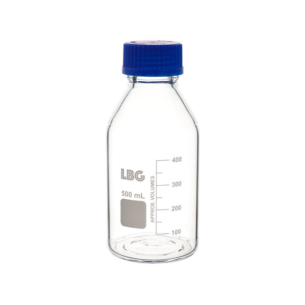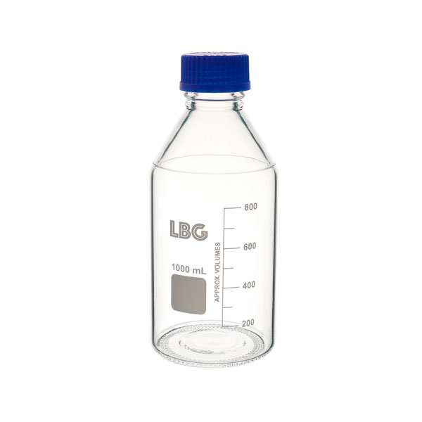 Aus Borosilikatglas 3.3. Vollständig autoklavierbar bis 134 °C. Gewinde GL 45, gemäß ISO 4796. Mit Ausgießring und blauer Schraubverschlusskappe aus Polypropylen.