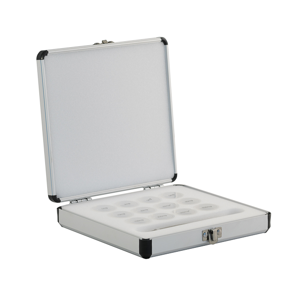 Etui mit zwölf Gewichten. Gemäß den Empfehlungen der OIML R-111. Zertifikat nicht inbegriffen. Die 2, 20 und 200 mg Gewichte sind doppelt enthalten.