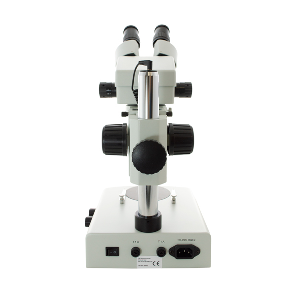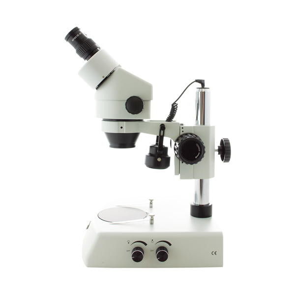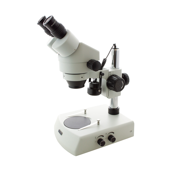 Binokular-/Trinokular-Stereomikroskop mit Greenough-Optiksystem, 360°-Drehung und 45°-neigbarer Kopf, ±5 Dioptrienausgleich, Teilungsverhältnis 50/50, 20/80, 0/100 und Augenabstand zwischen 54 mm und 76 mm. Weitfeld-Okulare WF10X/20mm und stufenloses Zoomobjektiv 0,7X-4,5X, mit Standardvergrößerung 7X-45X (erweiterbar auf 2,1X-270X). Einstellbare LED-Beleuchtung für Auf- und Durchlicht. Basis mit transparentem Teller und Probenhaltern. 110-240 V, 50/60 Hz. Garantie 2 Jahre.