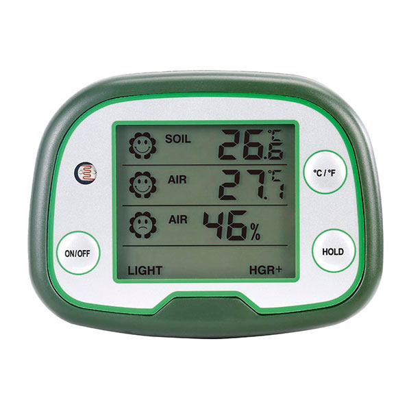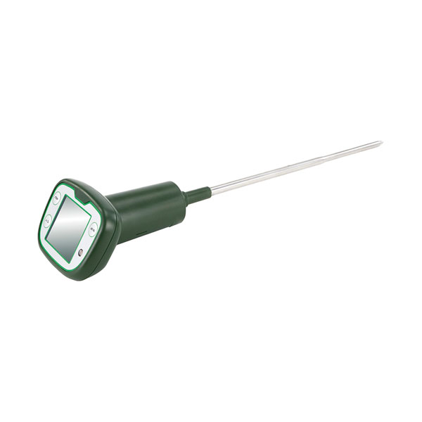 Thermohygrometer für die Untersuchung des Bodens und der Umgebung von Pflanzen. Anzeige der Umgebungstemperatur, Bodentemperatur, Luftfeuchtigkeit und Sonnenintensität. Temperaturanzeige: °C / °F. Messbereich der Bodentemperatur: -20 – 70 °C (-4 – 158 °F), Auflösung 0,1 °C/°F. Messbereich der Umgebungstemperatur: -10 – 50 °C (+14 – 122 °F), Auflösung 0,1 °C/°F. Messbereich der relativen Luftfeuchtigkeit: 20 – 99 %, Auflösung 1 %. Funktion zur Anzeige des Komfortniveaus. Betrieb: 1 x 9V Batterie. Maße: 368 x 83 mm.