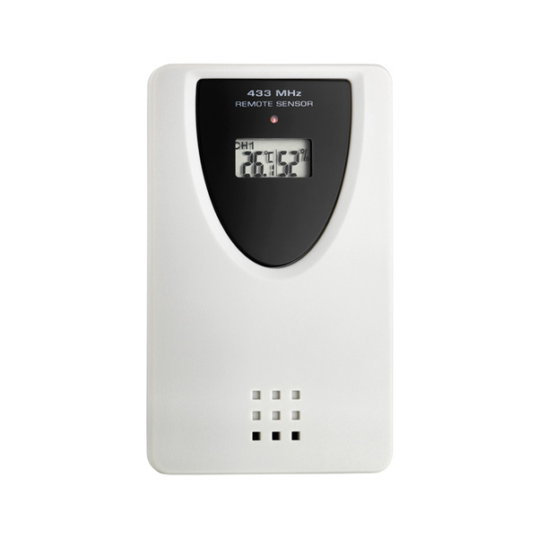 Datenübertragung mittels Funk von einem Fernsender aus. Temperaturmessbereich im Innenbereich: -10 °C – 50 °C; Auflösung: 0,1 °C. Temperaturmessbereich im Außenbereich: -20 °C – 50 °C; Auflösung 0,1 °C. Feuchtigkeitsmessbereich im Innenbereich: 20 – 95 %; Auflösung: 1 %. Feuchtigkeitsmessbereich im Außenbereich: 20 – 99 %; Auflösung: 0,1 %. Inklusive Fernsensor mit einer Reichweite von 30 m in offenen Räumen. Speicher von Maximal-/Minimalwerten mit automatischem Reset 24h. Betrieb: 2 x AAA-Batterien (nicht inbegriffen). Maße: 137 x 97 x 19 mm.